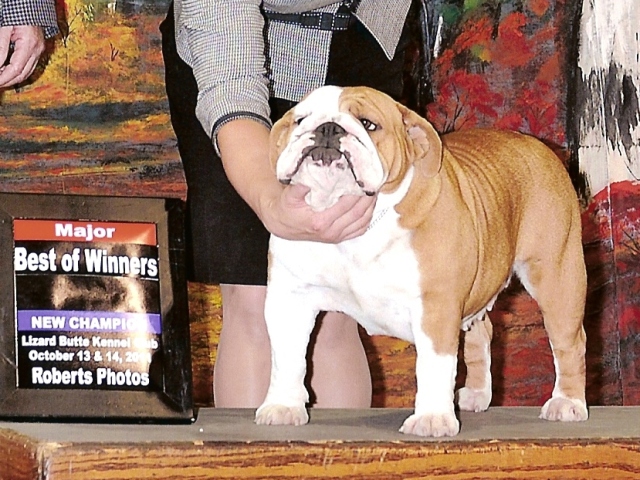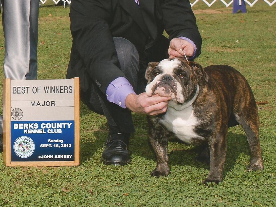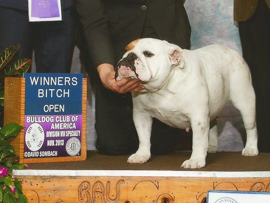 | AKC CHAMPION Isis completed her championship on January 25, 2014. Her wins include going Winners at the BCA DIV 8 Specialty during Nationals Week. Isis has an outstanding head, amazing jaw, exceptional turn up, beautiful body, gorgeous layback, wide chest and a remarkable gait. |