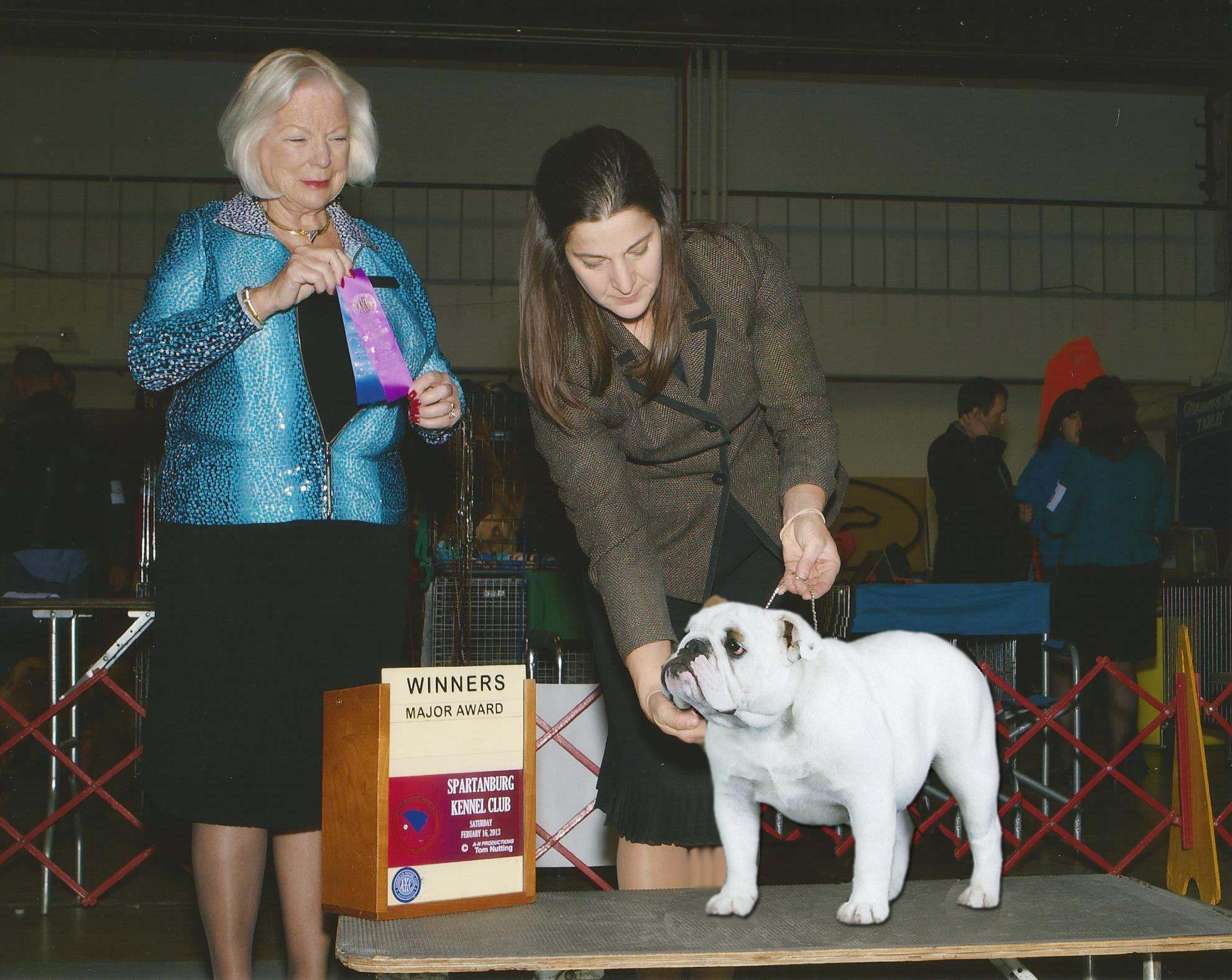 | AKC GRAND CHAMPION Paris completed her Grand Championship on September 2, 2013. Paris completed her championship on March 16, 2013 at 10 months of age. She completed her championship with all Majors including a Specialty Major. Paris has an outstanding head, amazing jaw, exceptional turn up, beautiful body, loads of bone, wide chest and a remarkable gait. |